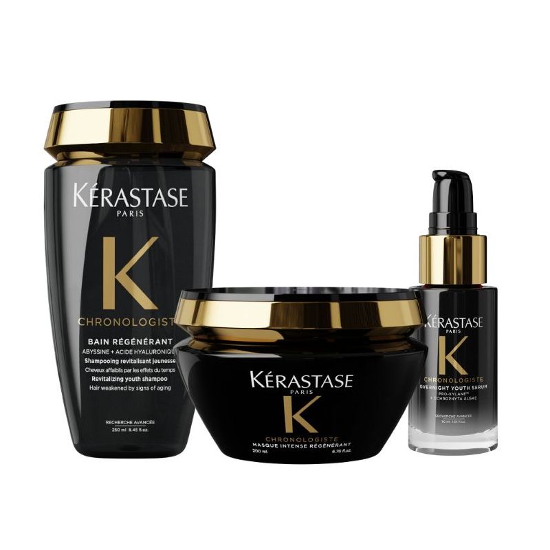 Le Trio Chronologiste Kérastase est une routine capillaire d’exception dédiée aux cheveux affectés par les signes du temps : sécheresse, ternissement, frisottis, perte de volume et d’épaisseur. Inspirée des avancées de la science du soin de la peau, cette routine experte agit sur la longévité capillaire pour révéler des cheveux visiblement plus forts, plus denses et plus brillants. Grâce à une synergie d’actifs puissants tels que l’acide hyaluronique, l’abyssine, le Pro-Xylane™ et l’algue Ochrophyta, Chronologiste offre une transformation immédiate et durable, tout en enveloppant la chevelure du parfum signature iconique de la gamme.