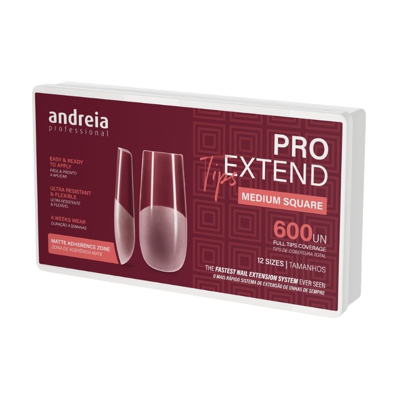 Capsules Pro Extend Tips medium square Andreia Optez pour les Capsules Pro Extend Tips medium square Andreia , idéales pour une extension d'ongles express et réussi. Ces tips à couverture totale, avec un format prédéfini, s'appliquent rapidement et facilement, sans limage requis. Fabriquées en matériau ultra résistant et flexible, elles comportent une zone d'application du gel mate pour une adhérence maximale. Format Medium Square 12 tailles avec 600 unités Aucune nécessité de limage Matériau durable et flexible Zone de gel mate pour meilleure adhésion Application : Utilisez en combinaison avec la lampe Pro Extend Lamp pour une application et une adhésion parfaites. Placez les tips et catalysez les après application du gel sur l'ongle natu