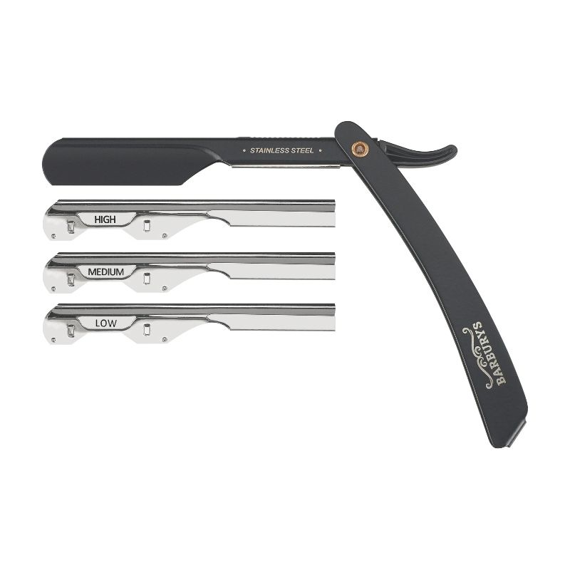 Entdecken Sie den Rasierer Knut von Barbury's, eine wahre Innovation in der Welt der Barbierkunst. Dieser vollständig aus rostfreiem Stahl gefertigte Rasierer zeichnet sich durch sein intelligentes System aus, das die Wahl zwischen drei Klingenlängen ermöglicht: kurz, mittel und lang. Er ist perfekt für alle Rasiertechniken geeignet und sorgt für vielfältige und präzise Ergebnisse.