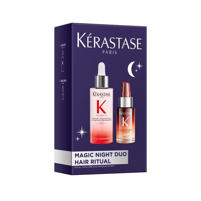 Give your hair an exceptional night with the Magical Night Duo Set from Kérastase, which includes the Genesis Fortifying Anti-Hair Loss Serum and the 8H Night Serum. These two iconic serums work together to slow down hair loss and revitalize the hair fiber overnight. The Genesis Serum, enriched with Aminexil and ginger root, strengthens the hair fiber, while the 8H Night Serum nourishes and repairs dry and damaged hair, increasing hydration and reducing frizz. The result: stronger hair and less hair loss in the long term.
