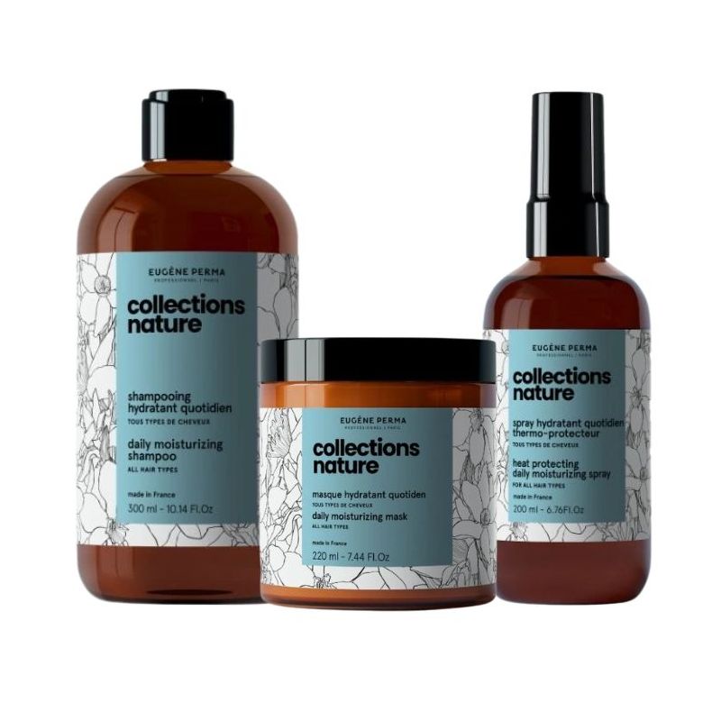 Eugène Perma Professionale Parigi presenta Collezioni Natura: una gamma di trattamenti per capelli esperti, naturali, vegani* e prodotti in Francia. Progettato per i capelli che necessitano di idratazione quotidiana, questo duo associa uno shampoo idratante a una maschera nutriente per apportare morbidezza, flessibilità e comfort alla fibra capillare.
