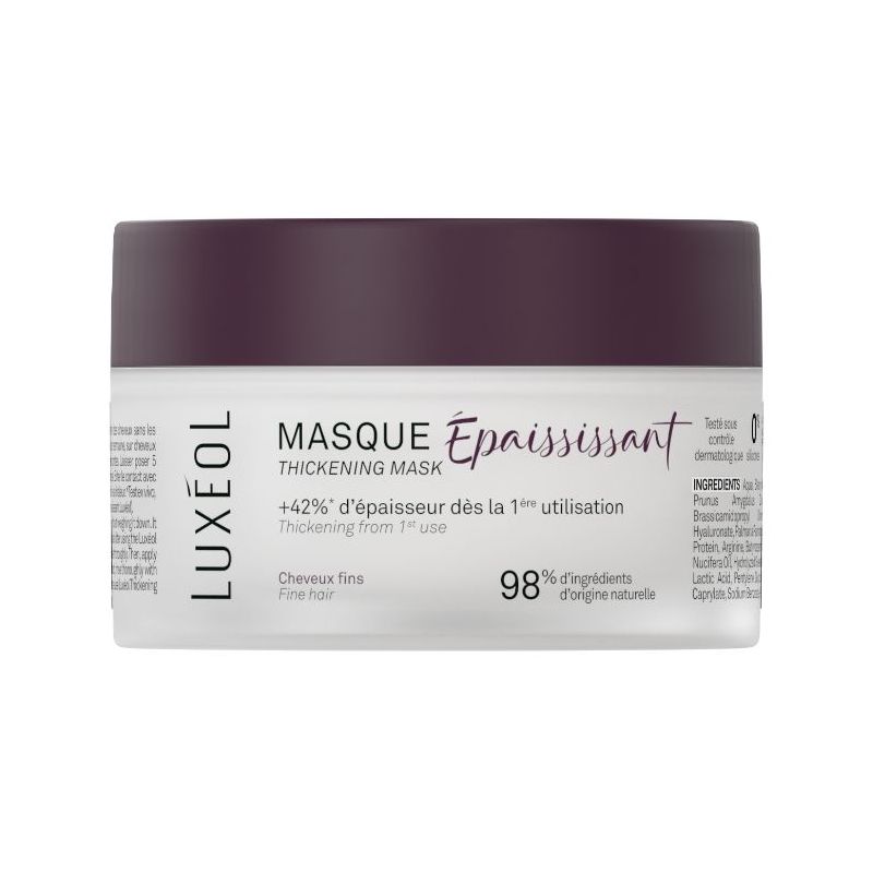 Composizione : AQUA, STEARYL ALCOHOL, CETYL ALCOHOL, PRUNUS AMYGDALUS DULCIS OIL, GLYCERIN, BRASSICAMIDOPROPYL DIMETHYLAMINE, SODIUM HYALURONATE, PALMARIA PALMATA EXTRACT, HYDROLYZED RICE PROTEIN, ARGININE, BUTYROSPERMUM PARKII BUTTER, COCOS NUCIFERA OIL, HYDROLYZED SWEET ALMOND PROTEIN, PARFUM, LACTIC ACID, PENTYLENE GLYCOL, LEVULINIC ACID, GLYCERYL CAPRYLATE, SODIUM BENZOATE, POTASSIUM SORBATE. Conseils d'utilisation : Après le shampooing, sur cheveux rincés et essorés, 2 à 3 fois par semaine, répartir sur les longueurs en insistant sur les pointes. Laisser agir 5 minutes. Rincer. Appliquer ensuite le sérum Épaississant Luxéol sur cheveux secs. Précautions d'emploi : Eviter le contact avec les yeux. En cas de contact, rincer abondamment à l'eau claire. Conserver à l'abri de la chaleur.