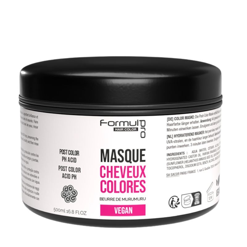Maschera per capelli colorati Vegan Formul Pro 500ml La maschera post-colore contiene burro di murumuru, olio di dattero e vitamina A, apportando brillantezza e protezione dai raggi UVA, mantenendo al contempo il colore dei capelli più a lungo. Contiene burro di murumuru per una nutrizione intensa Olio di dattero e vitamina A per protezione e lucentezza Protegge dai raggi UVA Prolunga il colore dei capelli Applicazione : Applicare su capelli lavati e strizzati, lasciare in posa per qualche minuto e poi risciacquare abbondantemente. Contenuto : 500 ml