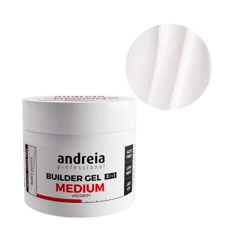 Scopri il Gel di costruzione viscosità media Soft White Andreia, un gel 3 in 1 a viscosità media progettato per un'applicazione senza sensazione di calore. Formulato senza acidi, questo gel è autonivelante e versatile, agendo come base, costruzione e top coat. La sua texture fluida assicura un'alta resistenza ed è compatibile con una catalisi LED e UV. Una scelta ideale per chi desidera un gel efficace senza compromessi.