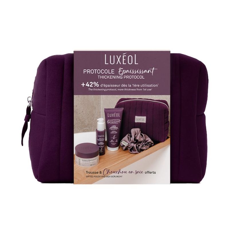 Composition : Luxéol Shampooing Épaississant : AQUA, COCAMIDOPROPYL BETAINE, GLYCERIN, SODIUM METHYL COCOYL TAURATE, SODIUM CHLORIDE, LAURYL GLUCOSIDE, SODIUM HYALURONATE, PALMARIA PALMATA EXTRACT, ARGININE, HYDROLYZED SWEET ALMOND PROTEIN, HYDROLYZED RICE PROTEIN, STARCH HYDROXYPROPYLTRIMONIUM CHLORIDE, PARFUM, COCONUT ACID, PHENETHYL ALCOHOL, GLYCERYL CAPRYLATE, LACTIC ACID, SODIUM LACTATE, UREA, CITRIC ACID, PENTYLENE GLYCOL, p-ANISIC ACID, LEVULINIC ACID, 1,2-HEXANEDIOL, SODIUM BENZOATE. Luxéol Masque Épaississant : AQUA, STEARYL ALCOHOL, CETYL ALCOHOL, PRUNUS AMYGDALUS DULCIS OIL, GLYCERIN, BRASSICAMIDOPROPYL DIMETHYLAMINE, SODIUM HYALURONATE, PALMARIA PALMATA EXTRACT, HYDROLYZED RICE PROTEIN, ARGININE, BUTYROSPERMUM PARKII BUTTER, COCOS NUCIFERA OIL, HYDROLYZED SWEET ALMOND PROTEIN, PARFUM, LACTIC ACID, PENTYLENE GLYCOL, LEVULINIC ACID, GLYCERYL CAPRYLATE, SODIUM BENZOATE, POTASSIUM SORBATE. Luxéol Sérum Épaississant : Aqua, Glycerin, Sodium Hyaluronate, Palmaria Palmata Extract, Arginine, Hydrolyzed Rice Protein, Aloe Barbadensis Leaf Juice Powder, Inulin, Parfum, Pentylene Glycol, Phenethyl Alcohol, Glyceryl Caprylate, Carbomer, Sodium Hydroxide, 1,2-Hexanediol, Levulinic Acid. Trousse : 100% coton Chouchou : Tissu tissé extérieur : 100% soie Elastique intérieur : 50,4% Polyester 49,6% Elastodiene Conseils d'utilisation : Luxéol Shampooing Épaississant : 2 à 3 fois par semaine, laisser agir puis rincer. Luxéol Masque Épaississant : Après le shampooing, sur cheveux rincés et essorés, 2 à 3 fois par semaine, répartir sur les longueurs en insistant sur les pointes. Laisser agir 5 minutes. Rincer. Appliquer ensuite le sérum Épaississant Luxéol sur cheveux secs. Luxéol Sérum Épaississant : 2 à 3 fois par semaine sur cheveux secs sur les longueurs et les pointes. Ne pas rincer. Précautions d'emploi : Luxéol Shampooing Épaississant : Agiter avant emploi. Éviter le contact avec les yeux. En cas de contact, rincer abondamment à l’eau claire. Conserver à l'abri de la chaleur. Luxéol Masque Épaississant : Eviter le contact avec les yeux. En cas de contact, rincer abondamment à l'eau claire. Conserver à l'abri de la chaleur. Luxéol Sérum Épaississant : Éviter le contact avec les yeux. En cas de contact rincer abondamment à l’eau claire. Conserver à l'abri de la chaleur. Chouchou : Tenir hors de portée des enfants de moins de 3 ans