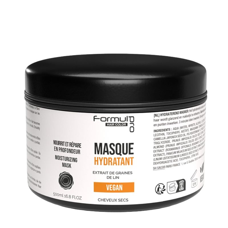Máscara hidratante Vegan Formul Pro 500ml A máscara para Cabelos Coloridos Vegan 500ml é muito rica em manteiga de Murumuru, óleo de tâmara e vitamina A. Esta máscara pós-coloração proporciona um brilho radiante enquanto protege seus cabelos dos raios UVA, permitindo que a cor dure mais tempo. Dê aos seus cabelos coloridos o cuidado e a proteção que eles merecem para um brilho duradouro.