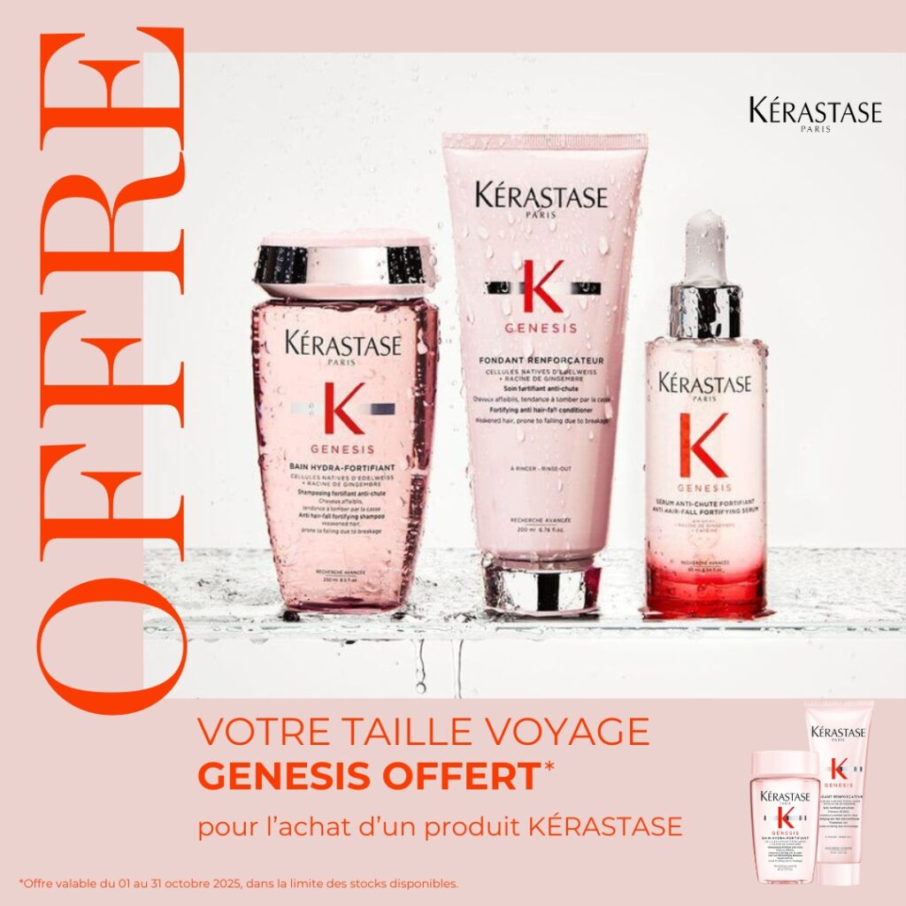 Du 1er au 31 octobre 2025, pour l’achat d’un produit Kérastase, recevez votre taille voyage Genesis OFFERTE